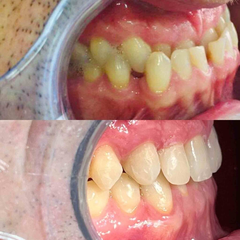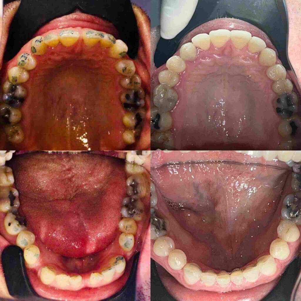 Una vez corregida la mala alineación dental, se abordó el problema del desgaste dental mediante la utilización de restauraciones de composite. En una sola sesión, sin necesidad de anestesia, se sellaron y reconstruyeron los dientes desgastados. El composite se aplicó cuidadosamente sobre las áreas desgastadas, restaurando la forma y la función de los dientes. Este proceso no solo mejoró la apariencia estética de la sonrisa del paciente, sino que actúa como capa protectora de los dientes desgastados ante futuros daños. El paciente pudo disfrutar de los resultados inmediatos y retomar su rutina diaria sin ninguna molestia adicional.